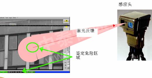工作時,激光發(fā)射裝置發(fā)射出編碼掃描激光束,每次照射覆蓋5度X 4 度的區(qū)域;與它同步的激光接收裝置隨即獲得激光圖像和該區(qū)域的可見光圖像。兩種圖像傳送至遙控單元后,由系統(tǒng)自動比較兩者的細(xì)微差別。如有差異,系統(tǒng)將在0.1秒內(nèi)啟動警報,并在監(jiān)視器上顯示發(fā)生異常的位置和圖像。操縱人員可以通過控制手柄放大觀察可疑區(qū)域,以進(jìn)一步確認(rèn)是否存在問題。
